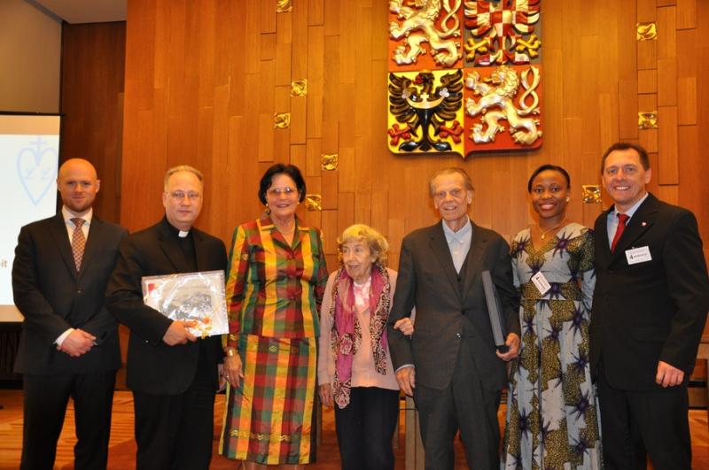 FOTO z leva: Lubomír Hajas (ředitel LL), Vojtěch Eliáš (prezident LL), Gudrun Freifrau von Wiedersperg (prezidentka DAHW) Sybila Holá, Jiří Holý (zakladatelé LL-Likvidace lepry, o.s.), Angie Kömm, Burkard Kömm (ředitel DAHW s manželkou)