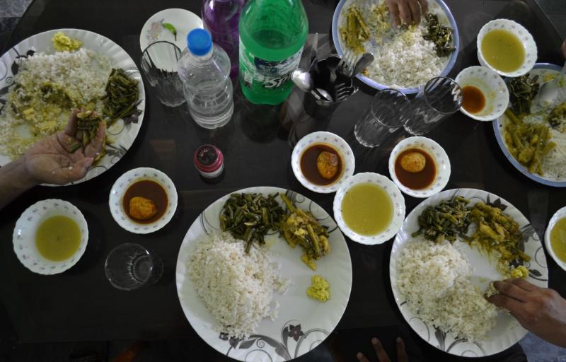 Na oběd je vždy rýže, která se průběžně zapíjí něčím, co bych nazval „speciální čočkovou polívčičkou zpravidla jantarové barvy“. Zní to sice strašně, ale je to celkem chutné a jako jedna z mála věcí je to nepálivé. Pokud to nechcete zapíjet, můžete si obsahem mističky rýži polít. K tomu vždy dostanete bohatou a často i pálivou zeleninovou oblohu (ne na syrovo jako u nás, ale vždy v nějaké zpracované polo-omáčkové formě). Tuto zeleninu dostanete částečně na talíři a většinou i v další extra mističce. A konečně v té poslední najdete i dvě až tři kostky masa v omáčce, kterou bych přirovnal k hodně pálivému guláši. Takže vždy kromě „hlavního“ talíře máte i dvě až tři malé mističky. Indové zpravidla jedí rukama, ale bělochům se celkem automaticky nabízejí vidlička a lžíce. Kvůli tomu, že se tu nejí polévky, jsou porce dost velké. Večeře je vždy podobná, ale nikdy se nejí úplně totéž.